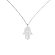 Minimalistický náhrdelník ALOve ze 14kt bílého, žlutého nebo růžového zlata, kterému dominuje symbolický přívěsek ruky (,,hamsa", ,,Ruka Fátimy") s diamantem. Luxusní šperk a ochranný talisman.