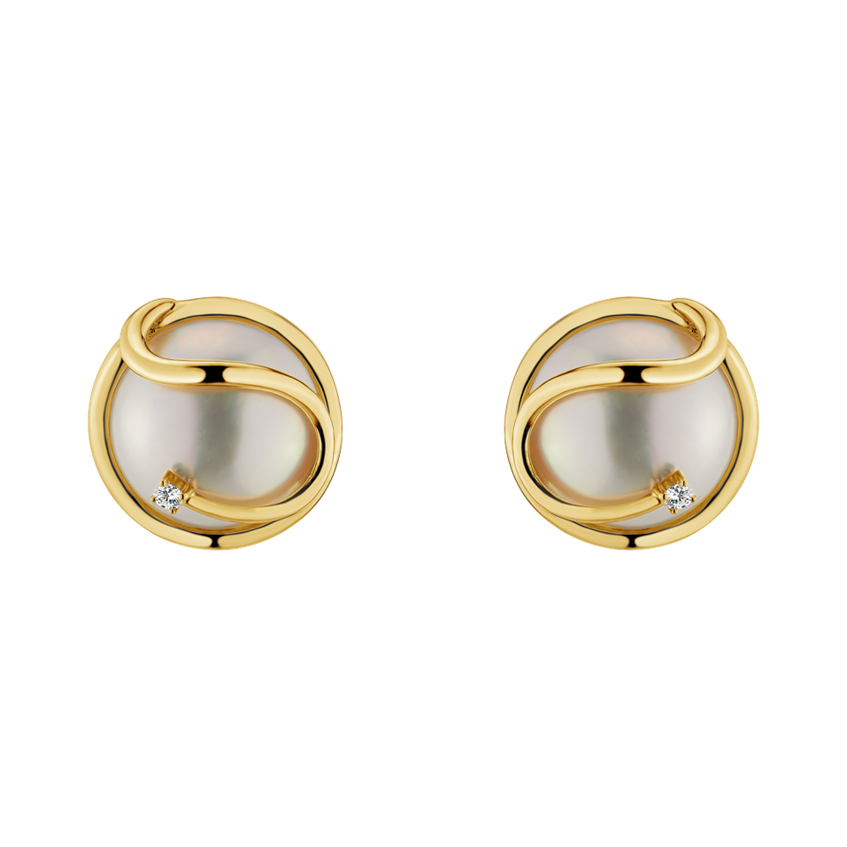 Elegantní náušnice s 18kt žlutým zlatem, diamanty a mořskou bílou perlou. Dokonalý doplněk pro každou příležitost k úspěchu. Šperk je součástí kolekce Ocean & River.