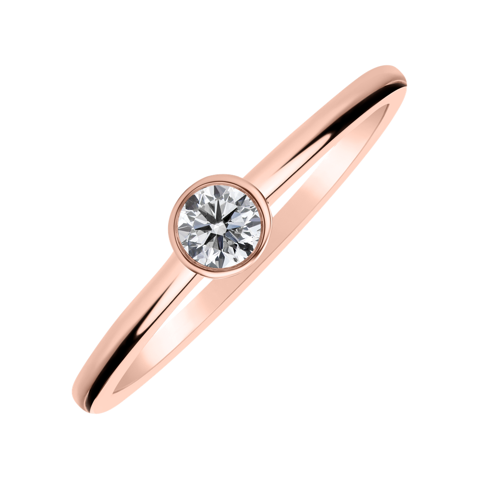 Jemný prsten z bílého, žlutého nebo růžového 14kt zlata. Zajímavě zasazený briliant kulatého brusu je spojením tradičního zásnubního prstýnku s praktičností hladkého tvaru. Šperk je vhodný pro žádost o ruku i jako krásný dárek.