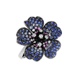 Úchvatný prsten v 18kt bílém a černém zlatě zdobený diamanty, který mu dodávají nezapomenutelný šarm. Tento šperk je dokonalým doplňkem pro elegantní večery a speciální příležitosti. Jeho diamanty a safíry společně vytvářejí harmonii vyzařující krásu a luxus. Šperk je součástí kolekce Flowers.
