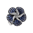 Diamanty, safír a preciznost. Prsten z 18kt bílého a černého zlata s diamanty a safírem je mistrovským dílem ruční práce a ozdobou pro ty, kteří znají hodnotu pravé krásy a síly. Šperk je součástí kolekce Flowers.