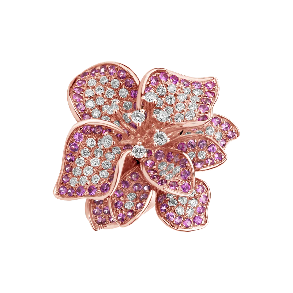 Tento růžový zlatý prsten s diamanty a safírem pink je mistrovským kouskem, který odráží vizi a odhodlání. Jeho zářivý design je oslavou úspěchů a výjimečnosti, ideální pro ty, kteří si cení kvality a elegance. Šperk je součástí kolekce Flowers.