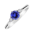 Luxusní prsten s centrálním tanzanitem je z každé strany doplněný čirým briliantem. Jemný prsten je vyroben ze 14-karátového bílého zlata. Šperk je úžasný jako zásnubní prsten nebo okouzlující dárek.