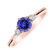 Luxusní prsten s centrálním tanzanitem je z každé strany doplněný čirým briliantem. Jemný prsten je vyroben ze 14-karátového růžového zlata. Šperk je úžasný jako zásnubní prsten nebo okouzlující dárek.