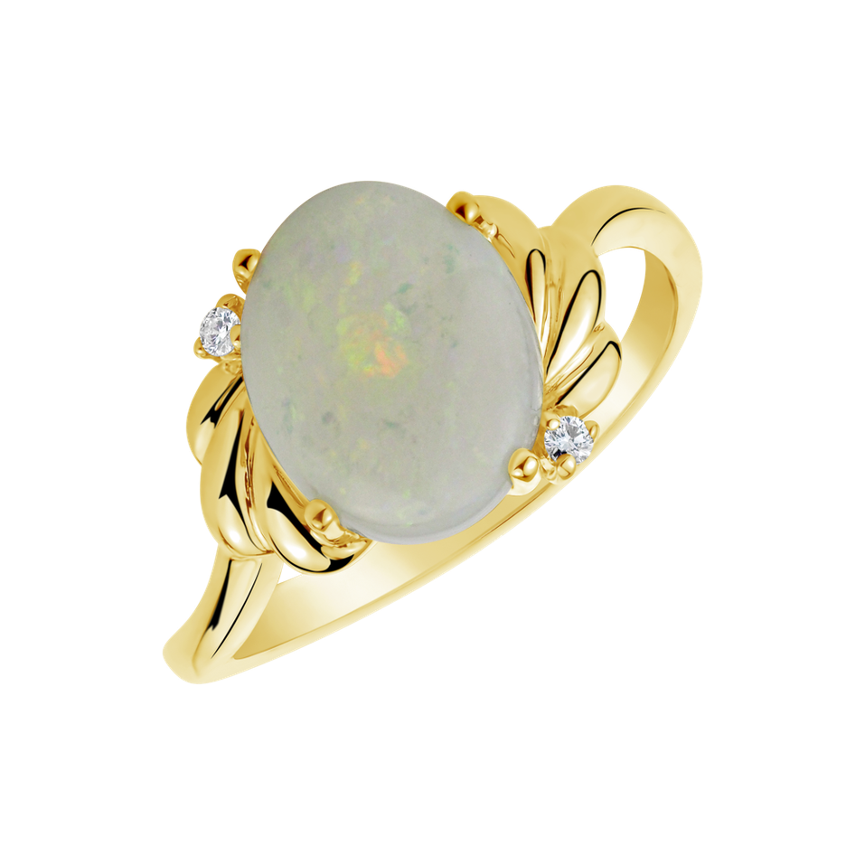 Skvěle vyladěný prsten z 14kt žlutého zlata zdobený brilantními diamanty a hlubokým opálem white je slavnostním vyjádřením hloubky vašich citů a honosným znamením vašeho vkusu. Šperk je součástí kolekce Blossoms.