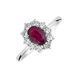 Snoubení 14kt bílého zlata, diamantů a rubínu v tomto prstenu vytváří odvážnou symbiózu, která je odrazem silné osobnosti a sebevědomé elegance. Luxusní šperky jako tyto nejenže zdůrazní vaši výjimečnost, ale také přinesou do vašeho života neopakovatelný nádech exkluzivity a noblesy, který si zasloužíte. Šperk je součástí kolekce Diana.